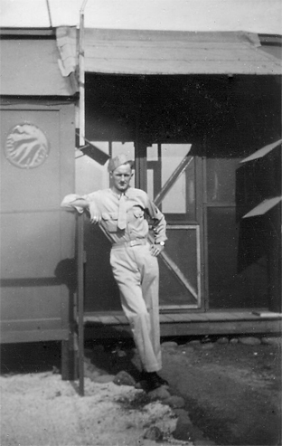 The English photos were taken when the garden border plants showed little growth, possibly late winter or early in spring. Other photos show this man in a hotter climate. On a building behind him is what we had thought to be a logo resembling a smoking volcano, perhaps a clue to its location. The 38th Engineers built airstrips and airbase facilities on Ascension Island and in Africa where these other photos may have been taken. But we now think the 'logo' may just be the reflections on the uneven surface of a material behind the circular window, as appears to be the case in this